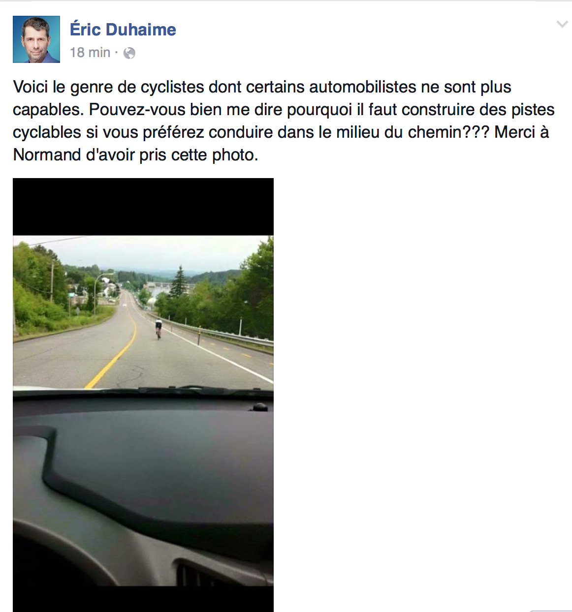 Pour Éric, un cycliste = tous les cyclistes! On généralise pas pantoute avec Duhaime! Commentaire inutile à m’envoyer: est-ce qu’il lui a roulé dessus? Navigation des articles ← Un chien, une chicane, une caméra et des matantes… Belle récupération cheap! → 117 Commentaires Commentaires en ligne Afficher tous les commentaires