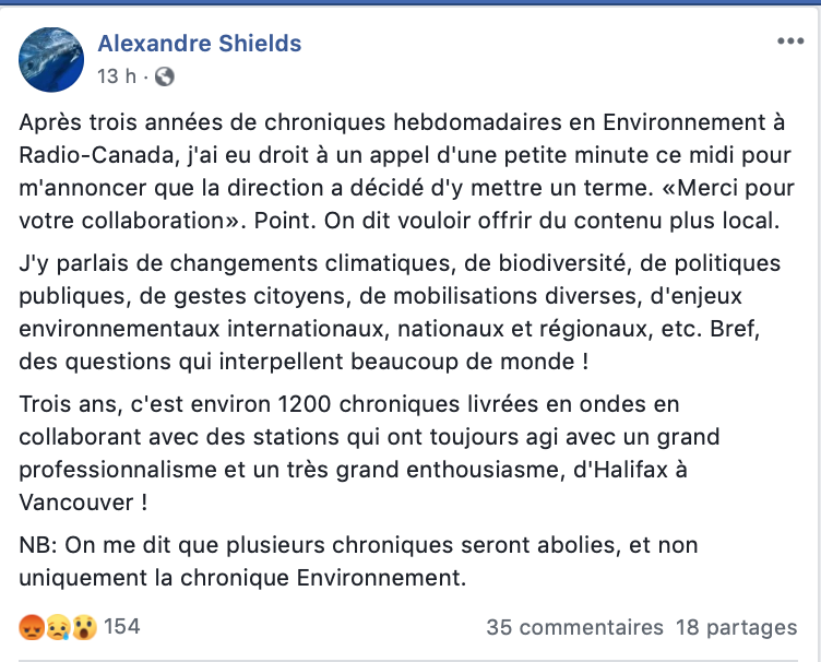 Perdre sa job à Rad-Can… c’est assez rapide! Mais c’est une coupure assez étonnante venant de Rad-Can… surtout concernant le sujet! Commentaire inutile à m’envoyer: il va être remplacé par Wauthier! Navigation des articles ← Le jab de Simon Olivier Fecteau à Maxime Bernier! Gênant… l’augmentation du nombre de signatures pour le Pacte!!! →