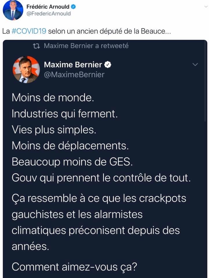Est-ce que Maxime Bernier s’est fait pirater son compte Twitter? Incroyable comment il peut être tata! Commentaire inutile à m’envoyer: il devrait animer à RadioX! Navigation des articles ← Ça c’est drôle! Bel exemple de solidarité humaine durant la crise… →