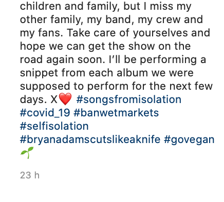 Une publication raciste de… Bryan Adams? Fuck*** bat eating! Regardez cette publication sur Instagram CUTS LIKE A KNIFE. A song by me. Tonight was supposed to be the beginning of a tenancy of gigs at the @royalalberthall, but thanks to some fucking bat eating, wet market animal selling, virus making greedy bastards, the whole world is now on hold, not to mention the thousands that have suffered or died from this virus. My message to them other than “thanks a fucking lot” is go vegan. To all the people missing out on our shows, I wish I could be there more than you know. It’s been great hanging out in isolation with my children and family, but I miss my other family, my band, my crew and my fans. Take care of yourselves and hope we can get the show on the road again soon. I’ll be performing a snippet from each album we were supposed to perform for the next few days. X❤️ #songsfromisolation #covid_19 #banwetmarkets #selfisolation #bryanadamscutslikeaknife #govegan🌱 Une publication partagée par Bryan Adams (@bryanadams) le le 11 Mai 2020 à 8 h 45 m PDT Commentaire inutile à m’envoyer: sur le BBQ, c’est bon! Navigation des articles ← Pour ou contre cette pétition! Arruda doit s’excuser d’avoir fait un beau geste maintenant! →