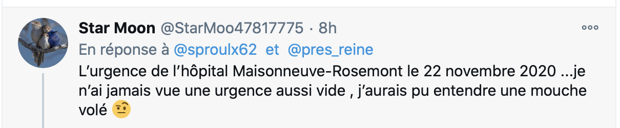 C’est pas parce que l’urgence est vide qu’il n’y pas de Covid! Les gens… Commentaire inutile à m’envoyer: ça veut dire que le confinement fonctionne! Navigation des articles ← Voir que les auditeurs de Denis Lévesque s’intéressent à ça! Manon… il y a juste toi qui rêve à un gros beigne! →