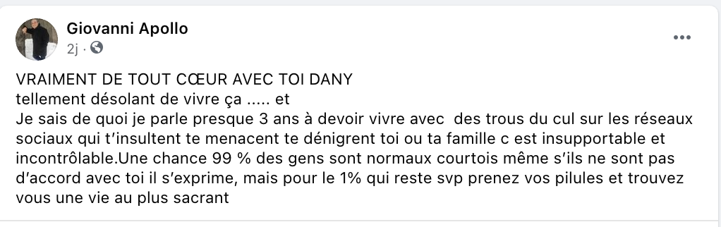 L’appui de Giovanni Apollo à Dany Turcotte… Comme s’il avait besoin de ça! Commentaire inutile à m’envoyer: c’est peut-être pas le bon Giovanni!!! Navigation des articles ← Le rap se porte bien au Québec… Il y a vraiment 43 000 matantes qui suivent un faux compte de Karine Vanasse? →