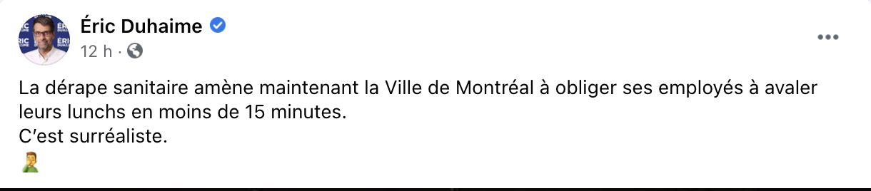 À Montréal, t’as 15 minutes pour manger sans ton masque! LOL… un sandwich et c’est tout!😂😂😂😂 Commentaire inutile à m’envoyer: moi, mon dîner, c’est un 5 services! Navigation des articles ← Est-ce qu’il y a un malaise avec la question de Pénélope à Geneviève Guilbeault??? Lorsqu’un journaliste de la Presse troll Bernard Lachance… →