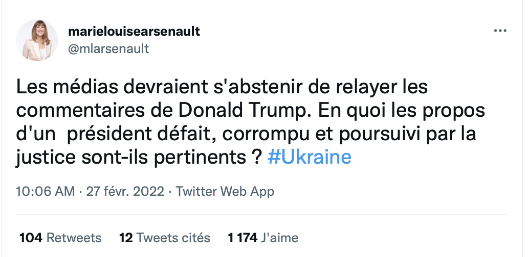 LOL…. C’est quand même un ancien président! Marie-Louise n’aime pas lorsqu’on parle de Trump! Une fille des médias en plus… Commentaire inutile à m’envoyer: elle est jalouse parce que personne lui demande son opinion à elle! Navigation des articles ← Martineau est vraiment en tab*** contre des artistes et une chanteuse! Renzel Dashington ramasse Guy A. sur l’hypocrisie de boycotter la vodka russe! →