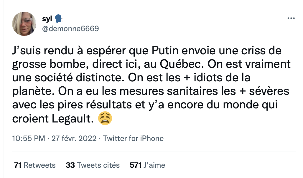 Espérer un bombe sur le Québec au lieu de porter le masque! La pandémie a fait mal aux gens!💊💊💊💊💊💊 Commentaire inutile à m’envoyer: Duhaime va la prendre dans son équipe!c Navigation des articles ← LOL…. André Arthur sur les soldats de Valcartier! Bernier se demande si Chrystia Freeland est une… nazie!!! →