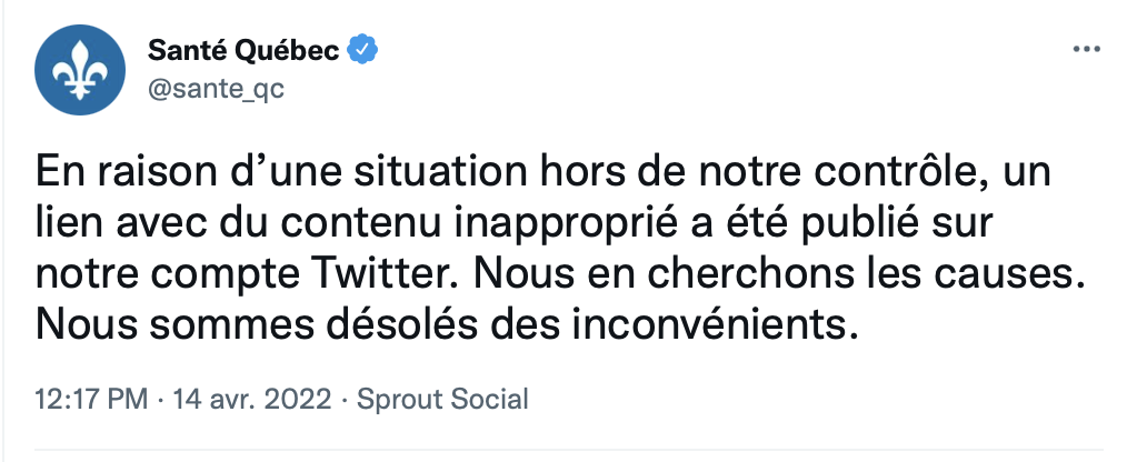 Santé Québec qui partage un lien… Pornhub sur Twitter! GIF un peu NSFW! Commentaire inutile à m’envoyer: on peut voir le clip? Navigation des articles ← Une amende record pour Collages Féminicides Montreal!!! Une coucou qui dit que l’homme n’est jamais allé sur la lune ! →