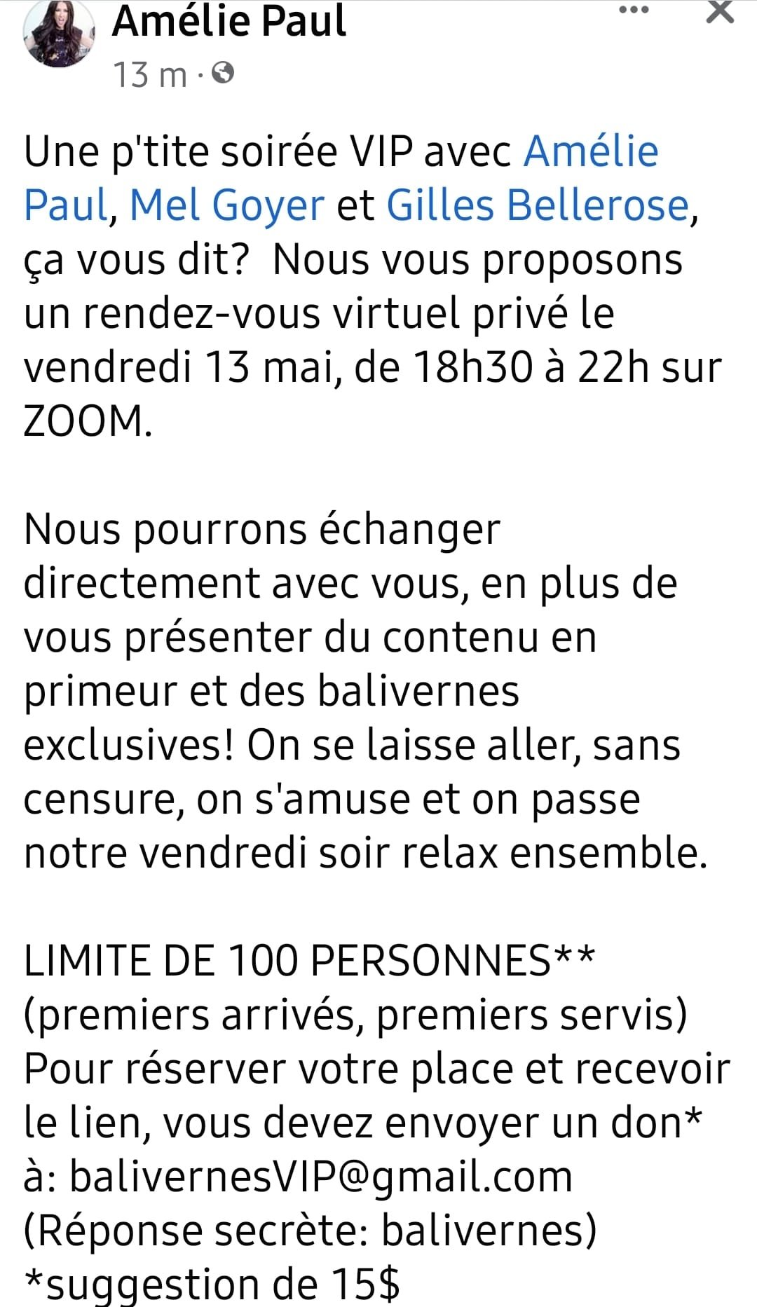 V’la ta chance de passer une petite soirée VIP avec Amélie Paul et Mel! Mais la suggestion de prix me gosse un peu…. trop cher pour moi!😂😂😂😂😂 Quoique c’est surement plus drôle que la Mazza! Commentaire inutile à m’envoyer: un limite sur un zoom??? Navigation des articles ← Il y a un hic… c’est faux! Les coucous rendent hommage à Bernard Lachance un an après sa mort! →