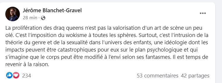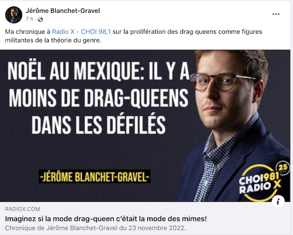 Jérôme Blanchet-Gravel à Radio X: Imaginez si la mode drag-queen c’était la mode des mimes! Misère… les commentaires en dessous! Commentaire inutile à m’envoyer: Je n’ai contre les drags c’est le nouveau je suis pas raciste, j’ai un ami noir! Navigation des articles ← Finalement… il fonctionne le système de justice! L’université Concordia qui utilise la police de caractère d’un… pédophile maintenant! →