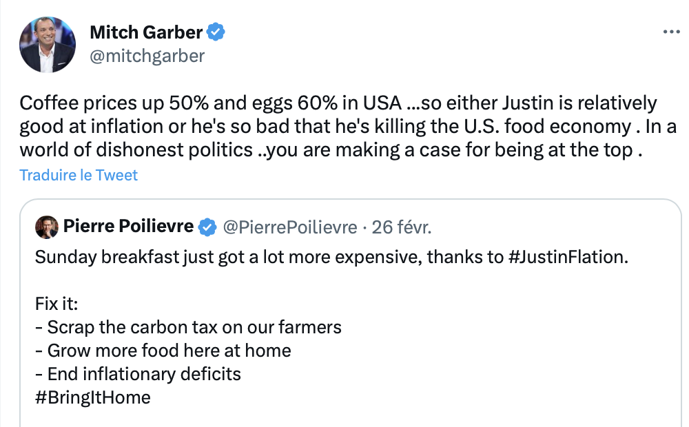 Sauf que c’est Poilievre qui dit que c’est la faute à Trudeau, alors que l’inflation est mondiale présentement.