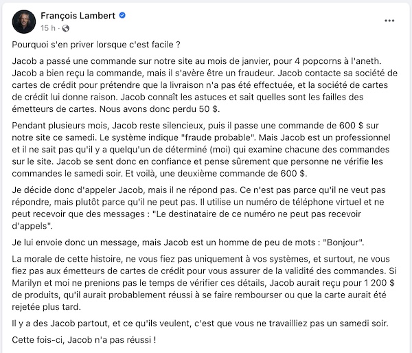 La morale de cette histoire: clairement plus personne t’invite a souper le samedi soir pis t’es un ost#$& de crosseur de vendre des pop corns à 12,50$ piece. Tu mérites de te faire frauder