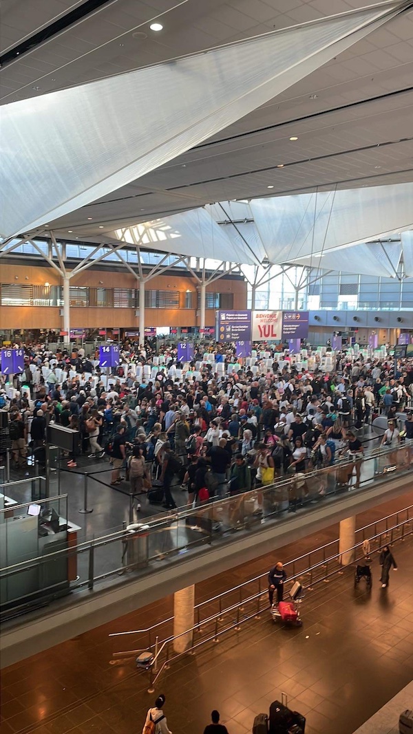 La photo ne révèle pas la réalité, malgré qu’il y a du monde ça va assez vite pour remplir les formalités avec les terminaux. La photo a été prise probablement lorsque plusieurs vols arrivent à l’aéroport Trudeau en même temps.
