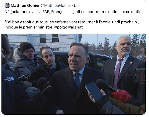 La FAE ne tombe pas dans le piège de Legault et ses manigances avec les médias! How It Started… How It’s Going… How It Started… How It’s Going… Commentaire inutile à m’envoyer: Legault est intelligent! Navigation des articles ← Ça serait pas long que je le sortirais de la salle lui! André Noël et sa lettre ouverte à Sonia Lebel! →
