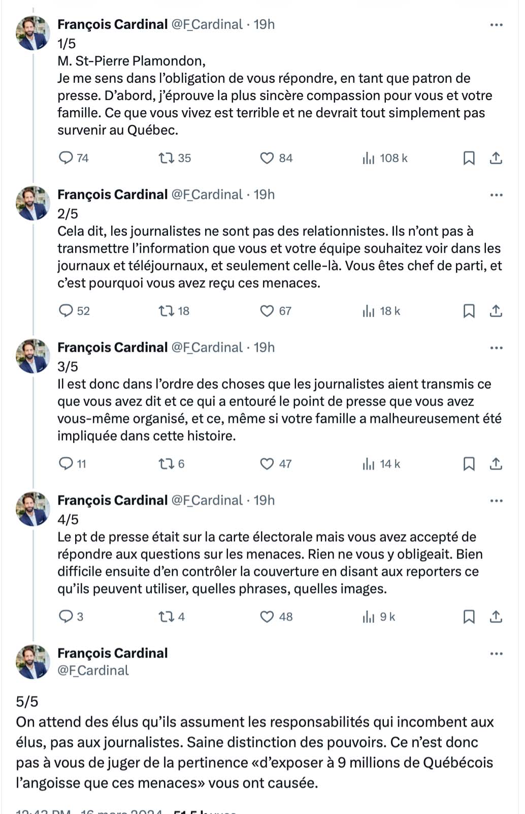 Pierre-Paul St-Pierre instrumentalise les pseudo-menace qu’il aurait peut-être reçu pour se faire du capital politique. La victimisation étant tres vendeur chez sa clientèle commune avec la CAQ.