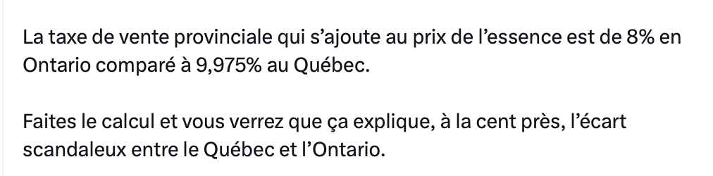 Même si le prix à la pompe affecte aussi tout les prix en épicerie, que comme société, on le paye aussi par la bande sur tout ce qui est transporté autrement qu’à dos de cheval, je continue de penser que le Québec est mieux de rester pauvre, de payer artificiellement trop cher son essence, de continuer profiter de la péréquation, et laisser nos richesses naturel là ou elles sont, afin que personne ne puisse en tirer de profit.