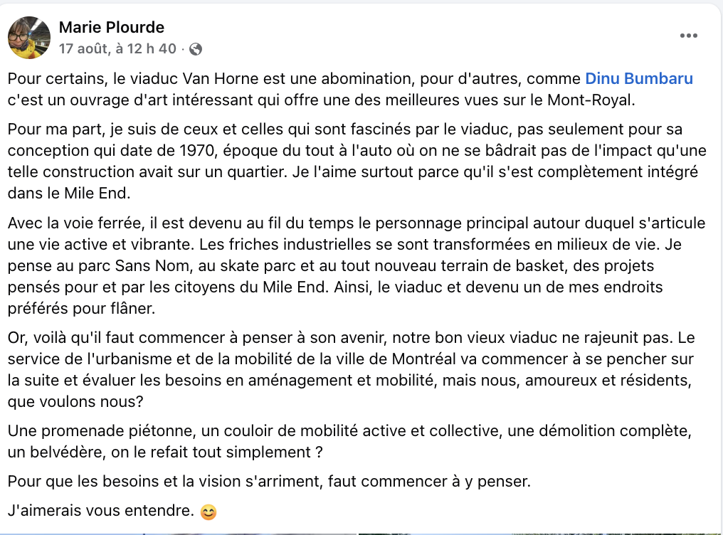 Marie Plourde sur le viaduc Van Horne qui est une abomination!