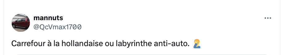 « Mannuts » n’a visiblement pas de grosses couilles. C’est pour ça qu’il conduit une Dodge Ram Charger à Montréal. Je suis tellement content que des imbéciles comme lui soient « agacés » par les nouvelles routes protégées.