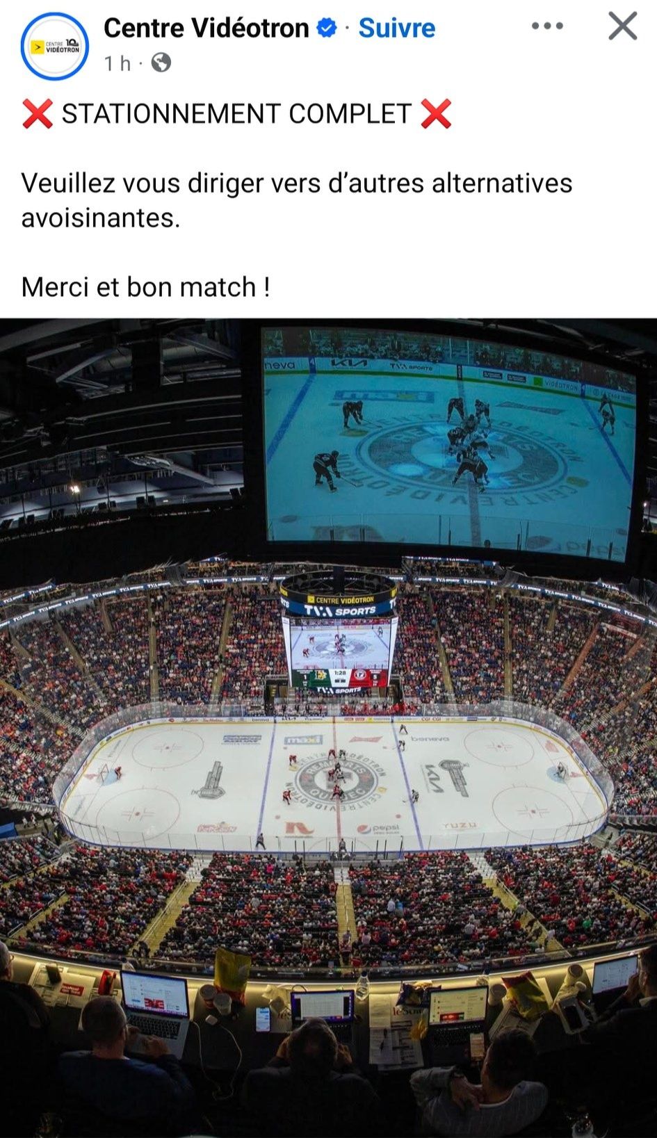 Au centre Bell de Montréal on dirait plutôt : « les rues sont pleines et on ne peut plus circuler en voiture. Veuillez vous diriger vers d’autres alternatives ».
