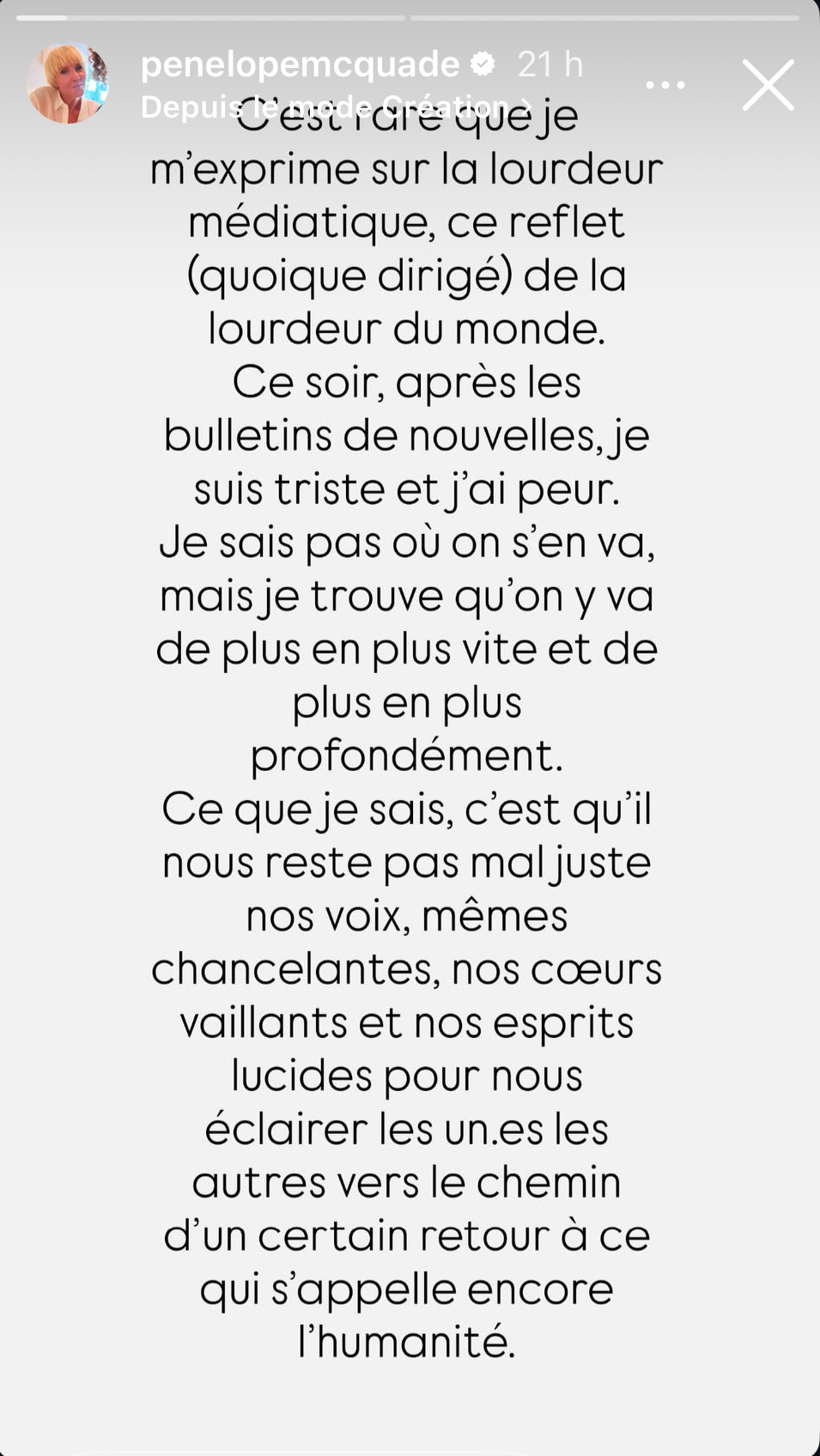 C’est pas elle qui avait fait un post Instagram semblable à celui pour dire qu’elle s’était fait frôler par un autre être humain dans une épicerie durant la pandémie et elle s’tait presque mise à pleurer « tellement le contact humain lui manquait »? C’est d’une lourdeur…