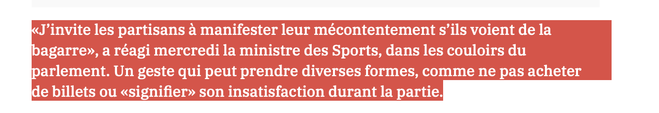 Inviter les partisans à manifester leur mécontentement quand il y a des bagarres. Non mais quelle nouille!!! Le monde va là précisément pour ça. Elle va bientôt demander aux clients des bars de danseuses de manifester leur mécontentement quand les filles retirent leurs bobettes.