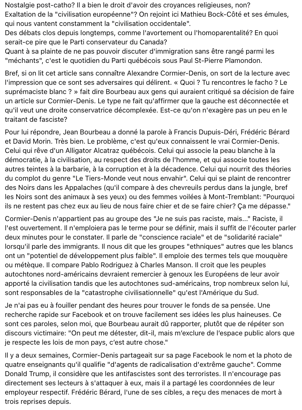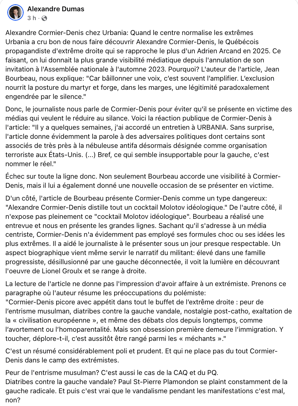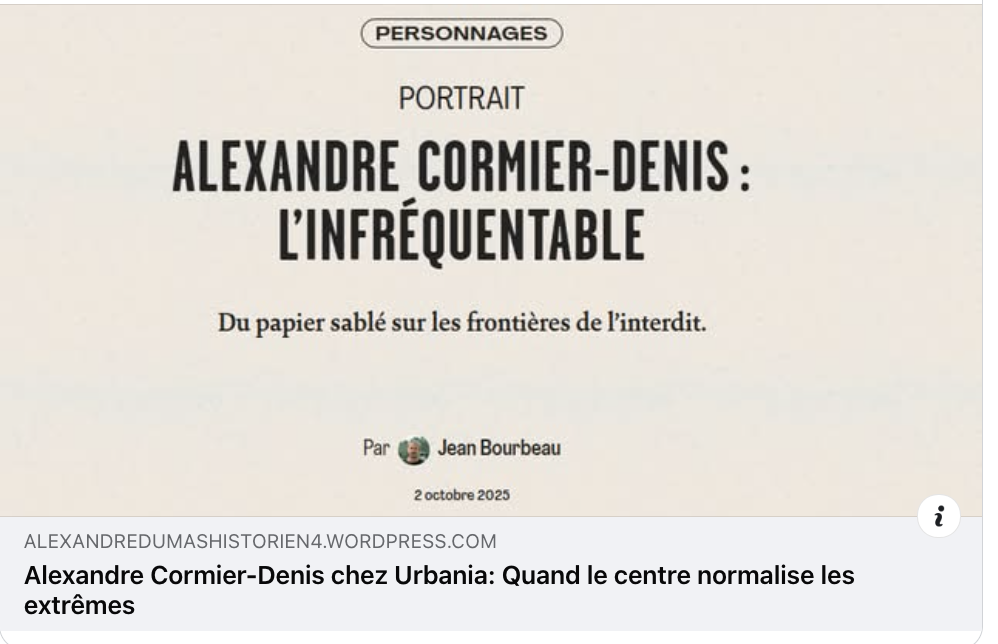Hot take: je préfère le « fascisme » (lol) de Cormier-Denis à toutes les imbécilités wokes et antifa d’Alexandre Dumas ou de Xavier Camus.
