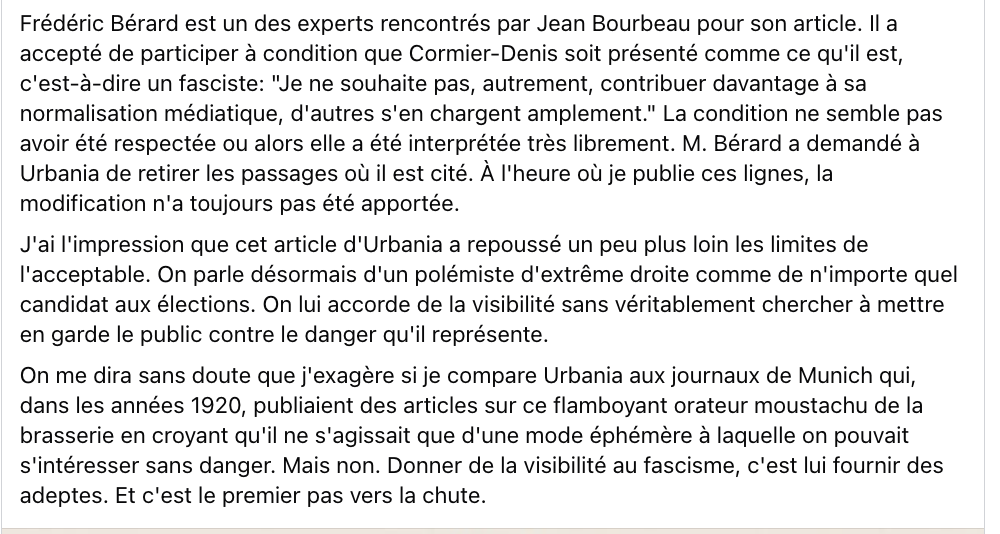 La partie la plus surréelle; Bérard qui participe juste si le type objet de l’article est présenté comme ce qu’il est (selon Bérard) soit un fasciste. Comme le journaliste ne semble pas traiter son sujet de fasciste bin Bérard demande à ne plus être cité dans l’article. Pis ce gars là est avocat.