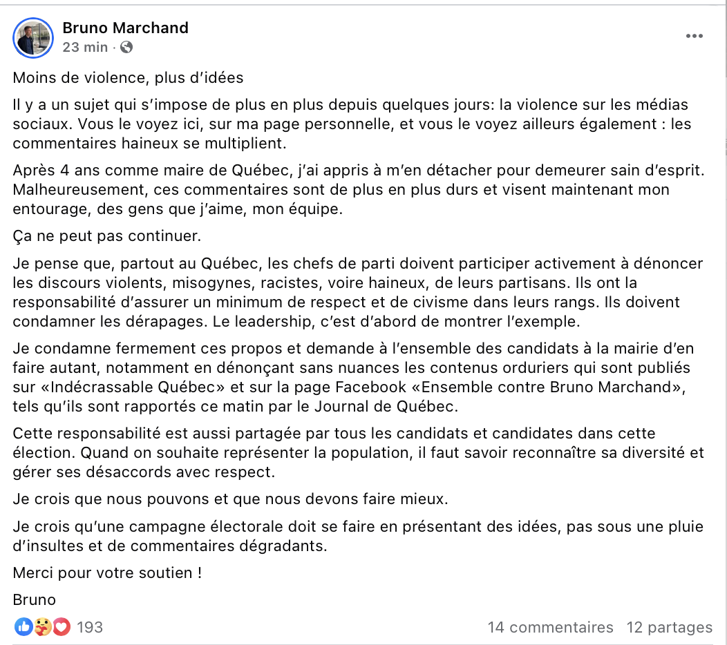 Pour répondre à Bruno Marchand et pour employer ses propres mots, «je pense que les chefs de partis doivent dénoncer le parti pris de Radio-Canada, de TVA ainsi que de tous les autres médias traditionnels en faveur de Bruno Marchand. Ils ont la responsabilité d’assumer un minimum de neutralité dans leurs rangs.»