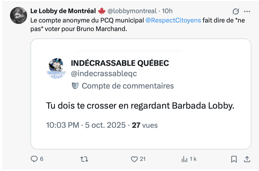Wellp, l’ironie ici, c’est que cette sortie vertueuse de Marchand… pleurant sur des commentaires Twitter, prouve le point du nom du compte en question : Indécrassable Québec. Marchand est un autoritaire libéral qui souhaite, comme le président de l’Angleterre, comme Carney, comme toutes les élites du Commonwealth, censurer la critique et les paroles dissidentes au nom d’une pseudo-lutte contre « la haine », terme dont les paramètres sont décidés par eux-mêmes. Vous êtes manipulable, les québécois. Cessez de vous soumettre à ce genre de manipulation mentale de la gauche mondialiste.