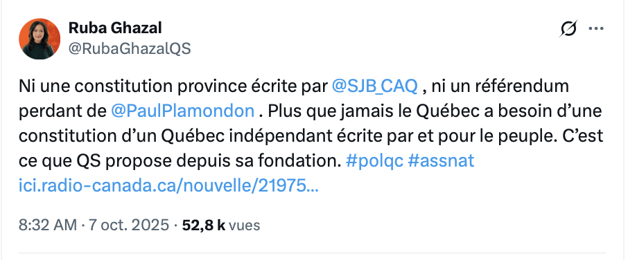 je suis certain que cette dame était très préoccupée par une constitution québécoise du haut de son trône dans son château à l’île bizard, payé par les contribuables.