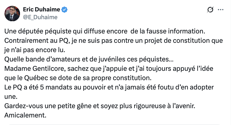 ETK moi je ne suis pas péquiste et je trouve pour le moins étrange qu’un tel parti qui veut « faire un pays » et qui a eu 5 mandats n’a même pas écrit l’ébauche de sa constitution.