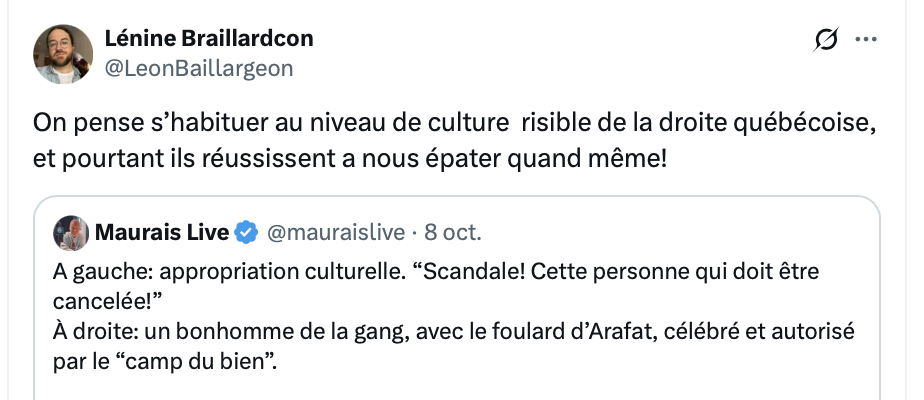 L’appropriation culturelle est un concept ridicule et risible inventé de toute pièce par la gauche. Leur remettre dans la face, comme bien d’autres de leurs contradictions, est toujours satisfaisant!