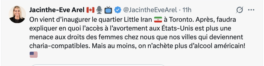 Vrai, le nom de ce quartier rappelle un pays où sévit malheureusement un régime intégriste, rétrograde et misogyne. Lors de l’arrivée au pouvoir de ce régime, bon nombre de ressortissants ont fui l’Iran – et surtout ce régime – et certains d’entre eux se sont établis à Toronto. C’est à ces gens que le nom du quartier rend hommage et non au régime des mollahs. Mais ça, ça semble trop compliqué à comprendre pour le psyché de madame Jacinte-Ève.