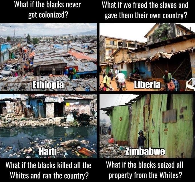 Avons qu’à l’époque du colonialisme, tous ces pays fonctionnaient bien mieux ! L’Afrique du Sud, depuis que les Blancs ont quitté, s’est rendue n’importe quoi, tout comme l’Algérie du temps des Français, Haïti, etc… Ce n’est pas pour rien que tous veulent venir vivre dans des pays de Blancs et non le contraire !