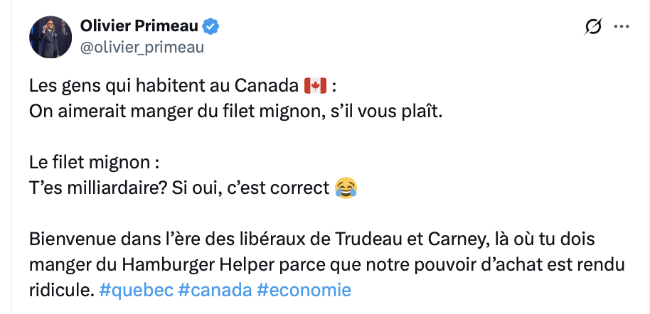 Le problème est plus le voisin du sud orange qui impose 25% de taxe sur l’import de bœuf canadien…les producteurs ont un manque à gagné ici…peu importe quel premier ministre sera en place il commencera pas à gérer les coûts d’opérations des producteurs…ya rien qui a pas augmenté depuis les dernières années…si ça pas augmenté regarde la quantité, les formats de tous ont diminués…