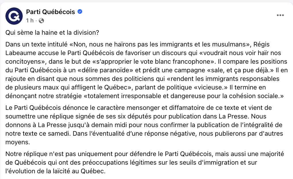 Pauvre Lebaume! Le bonhomme ne comprend pas le questionnement légitime sur la question de. L’immigration massive au Québec et au Canada. Son analyse se limite à diaboliser les tenants d’une immigration contrôlée qui permet une meilleure intégration à la société Québécoise. Au Canada le même problème se pose et déjà les libéraux de Trudeau qui hier proposait une immigration massive recule devant les problèmes reliés avec l’immigration massive. Lebaume est en retard sur la réalité et crache sur le PQ comme la Presse le fait toujours. On dirait que Lebaume travaille pour le conseil du patronat qui veut du cheap labour à tout prix.