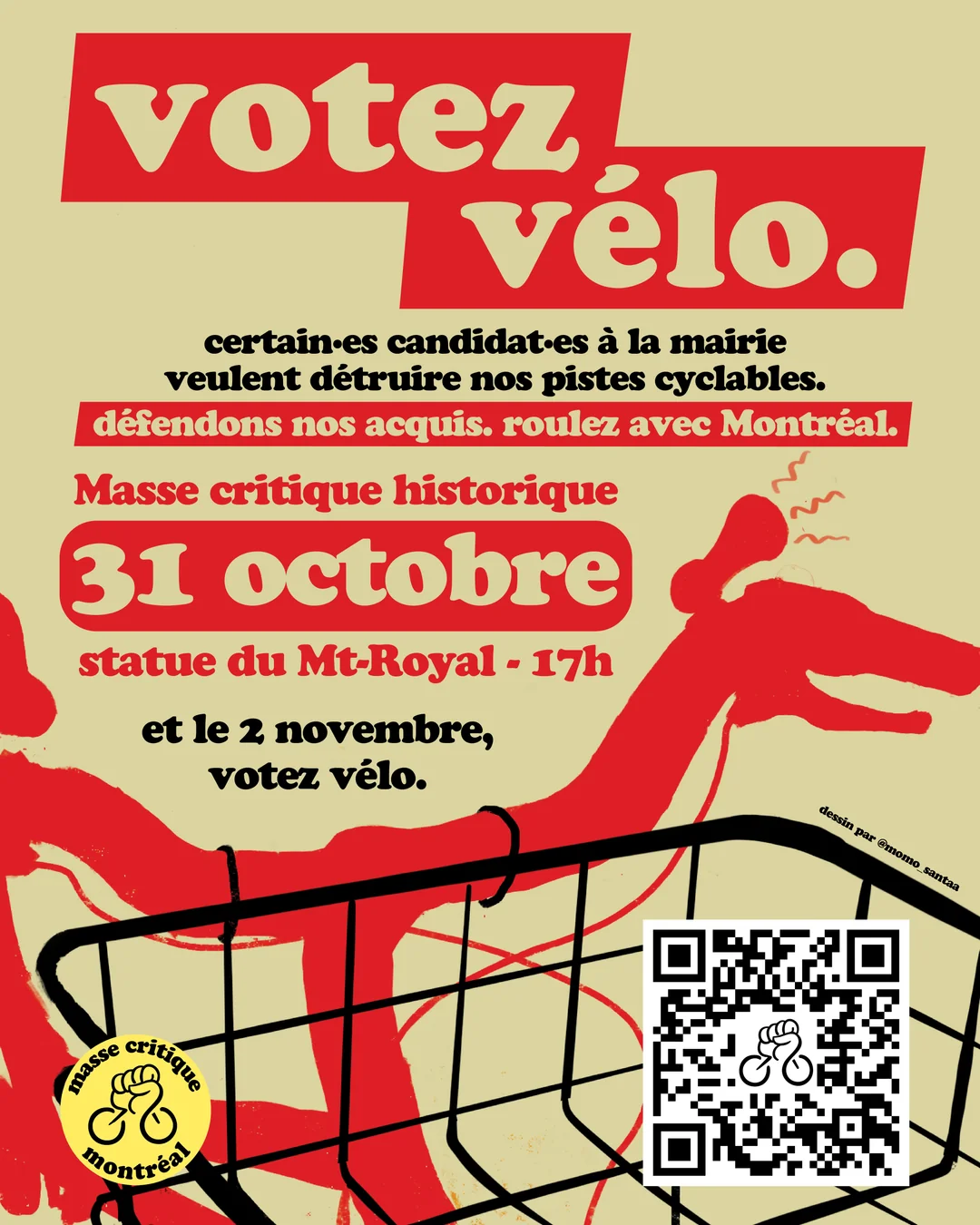 Le style de l’affiche est le même qu’on verrait sur celle d’un parti municipal gauchiste montréalais en 1974, et que dire du logo de Masse critique Montréal en bas: une main féministe enragée tenant une paire de couilles arrachées.