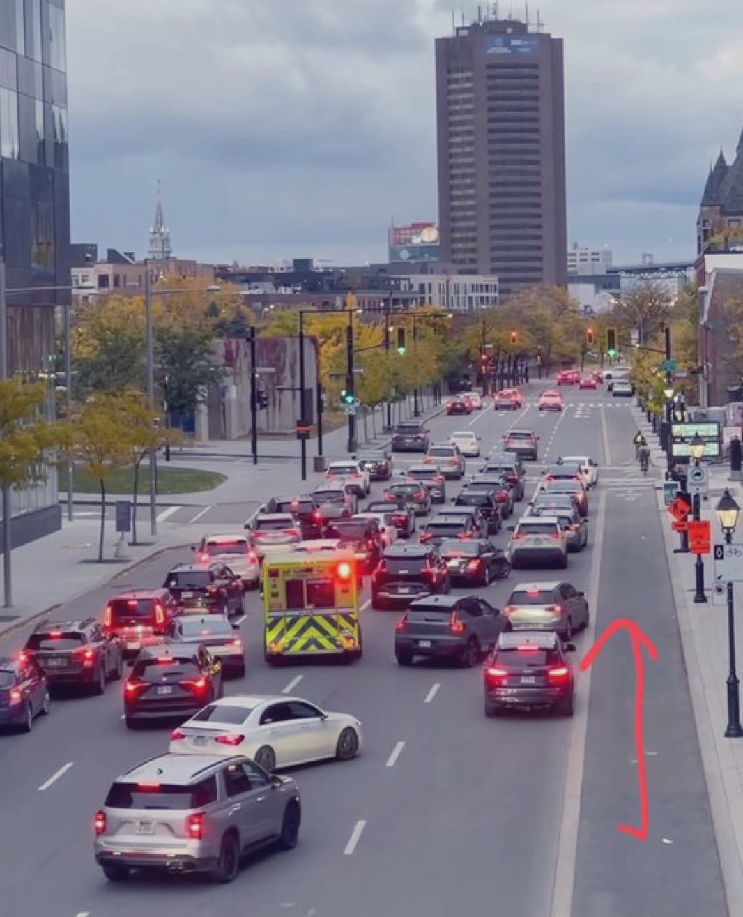 On voit bien que l’ambulance se dirige à gauche. Parce que le coin de l’édifice qu’on voit à gauche, c’est le CHUM. Passer à droite servirait à rien.