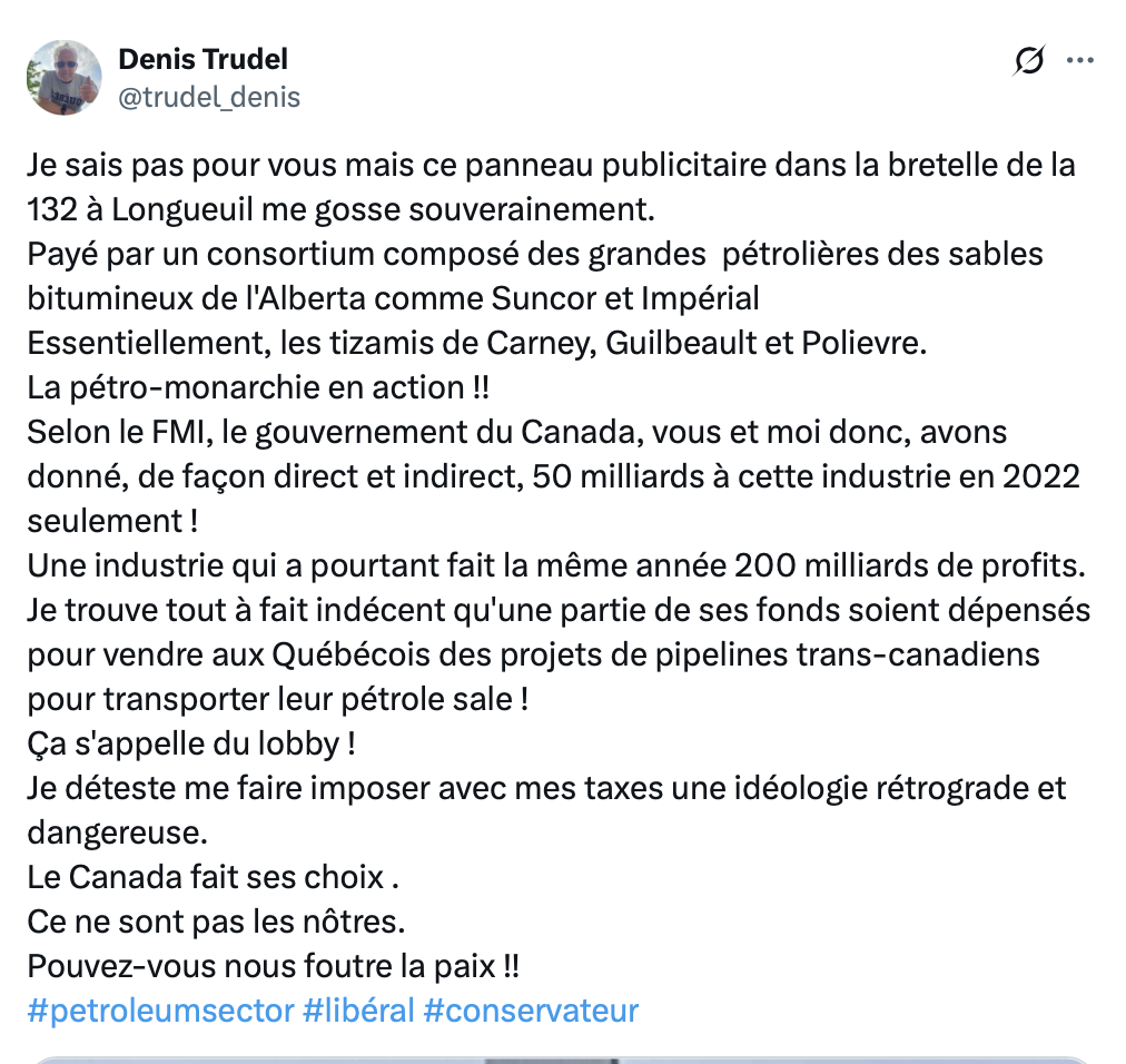 Je croyais que les 50 milliards de subvention gouvernementales aux pétro-voleuse nous permettais d’acheter notre essence en Montérégie au prix de 1,42$