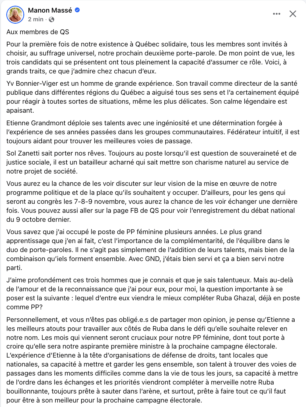 L’élection d’Étienne Grandmont et de Ruba Ghazal à la tête de Québec solidaire marque un moment d’une intensité rare, presque suspendu dans le temps politique du Québec. On dirait que quelque chose s’aligne, comme si le vent tournait enfin dans la bonne direction. Leur arrivée incarne une harmonie improbable entre la rigueur du terrain et la ferveur de la vision, une alliance où la lucidité et l’idéalisme cessent de s’opposer pour mieux s’épouser.