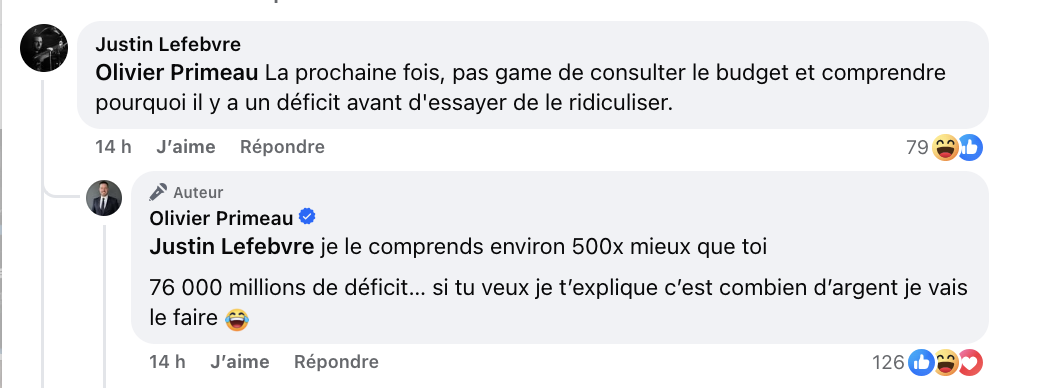 La différence entre Primo est sa crowd, c’est que pour sa crowd, c’est les autres qui vont ramasser la facture des déficits. Soit ceux qui payent de l’impôt parce qui sont riche, soit par les générations futurs de riche. Mais nous autre, on veut des investissement.
