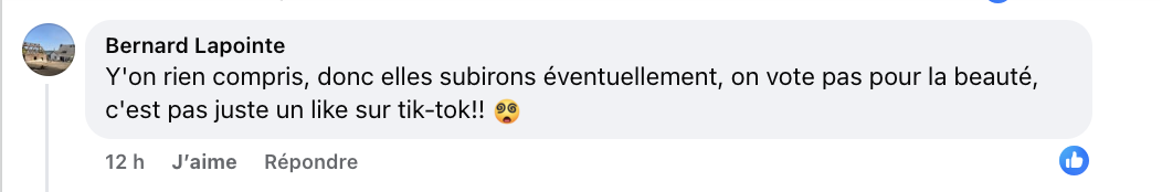 1- Y e tellement beau, y a l’air tellement fin…je vote pour lui ( j’y aime pas la face, elle a l’air d’une snob, je vote pas pour elle). Bref, l’apparence est plus importante que les enjeux.