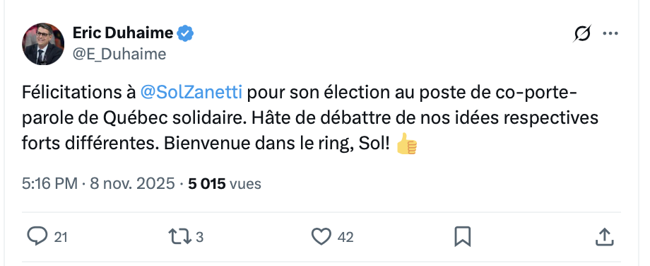 Plus le temps passe, plus Duhaime pense qu’il est politicien. À part ses licheux de cul, tout le monde se sacre de Duhaime et de son pathétique PCQ.