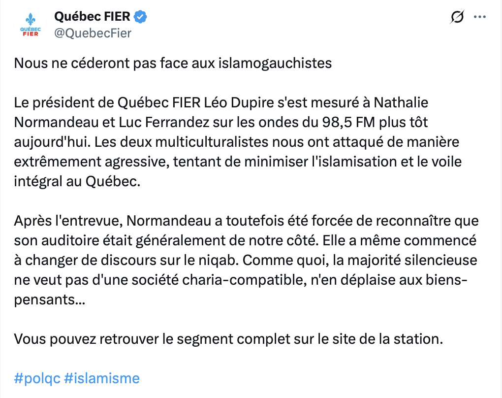 Le président de Québec FIER Léo Dupire s’est mesuré à Nathalie Normandeau et Luc Ferrandez sur les ondes du 98,5 FM plus tôt aujourd’hui. Les deux multiculturalistes nous ont attaqué de manière extrêmement agressive, tentant de… pic.twitter.com/pgx7nzfYBA