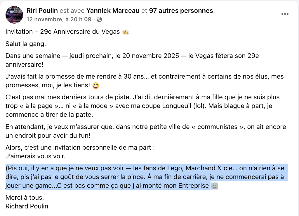 On a compris ton message Richard. Tu salueras Jeff, Réjean pis son set de boules.