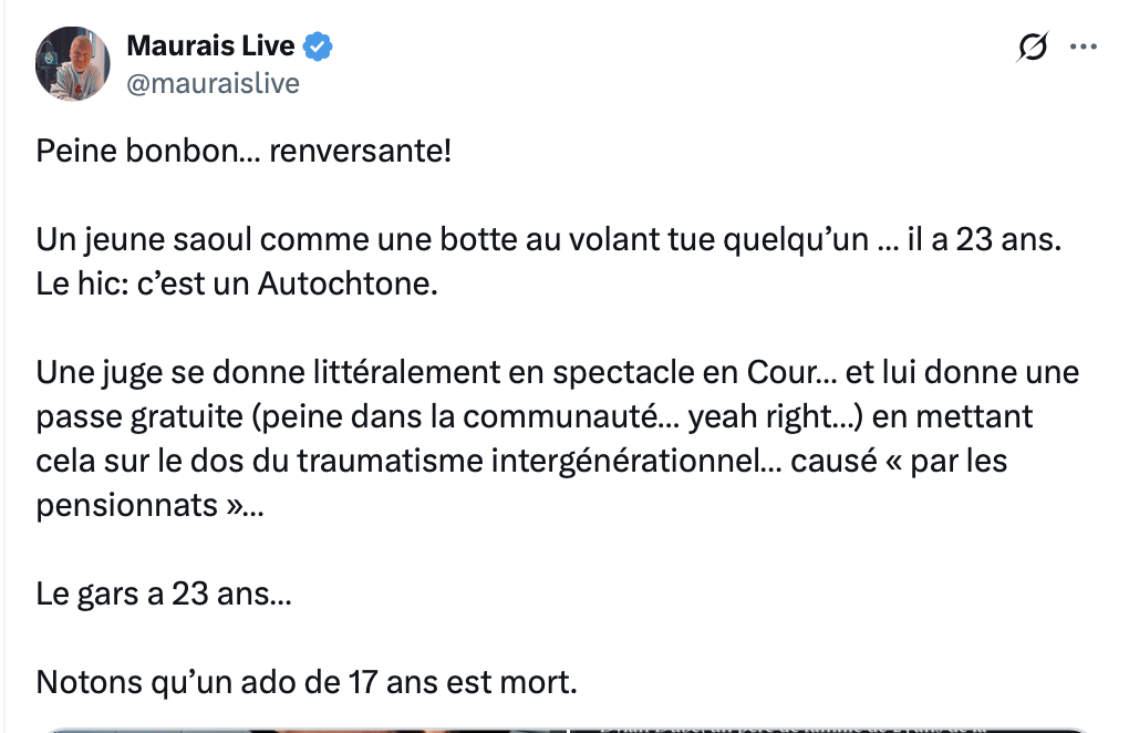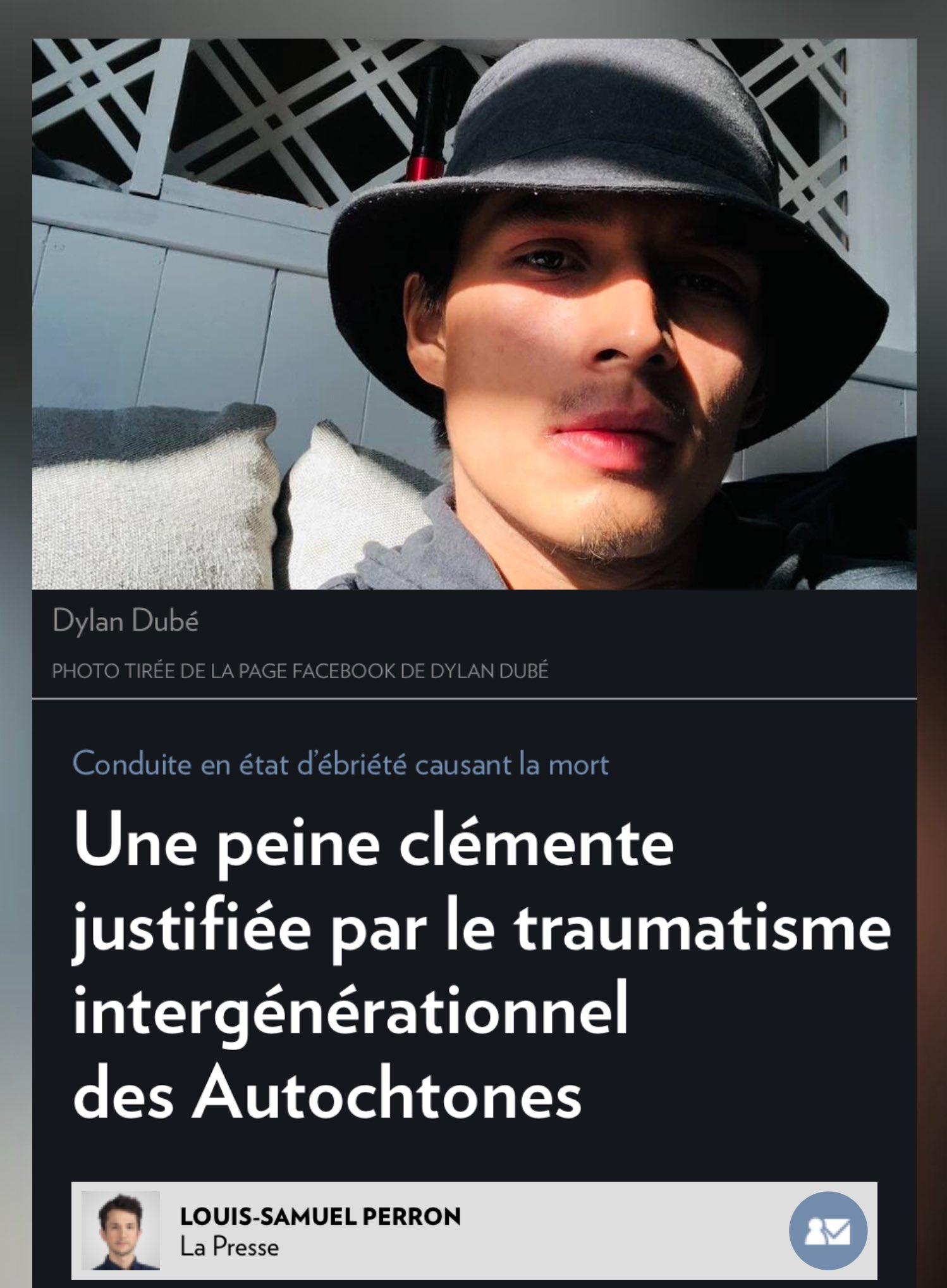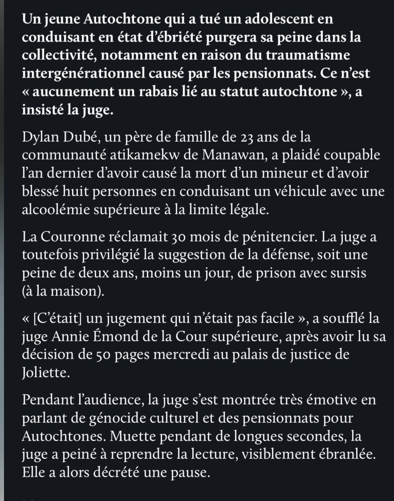 Et la juge qui se met à pleurer et à parler des pensionnats…notre système de justice est profondément vicié.