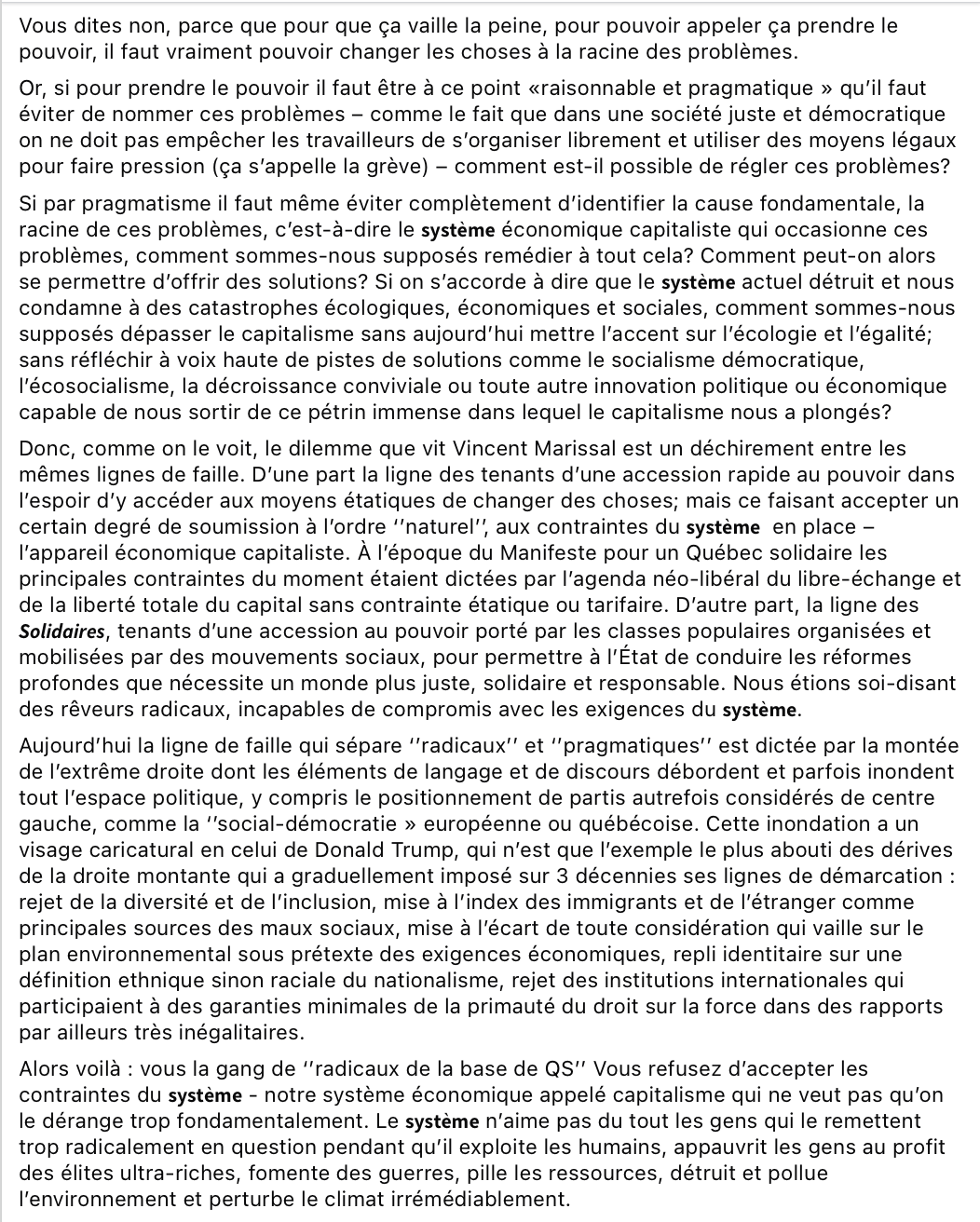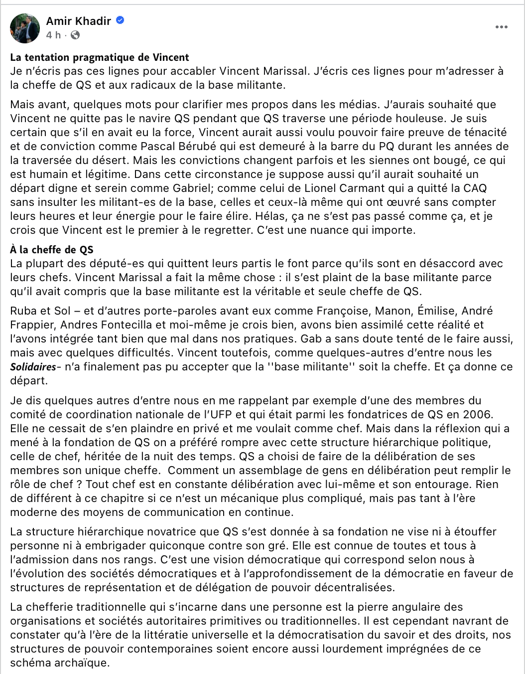 En gros, il dit comprendre que Marissal était en désaccord avec la base militante, mais rappelle que QS a choisi de fonctionner sans chef traditionnel. C’est la base qui décide, et c’est voulu. Khadir défend ce modèle parce qu’il pense qu’un parti centré sur un chef finit toujours par concentrer le pouvoir entre quelques mains. Selon lui, QS essaie justement de bâtir une démocratie plus participative, où les citoyens gardent plus de contrôle et où on évite les dérives des systèmes trop hiérarchiques. Marissal n’acceptait tout simplement pas cette façon de faire.