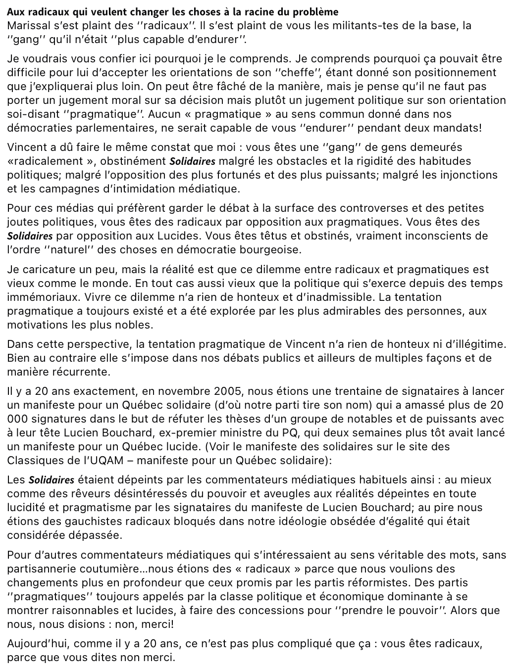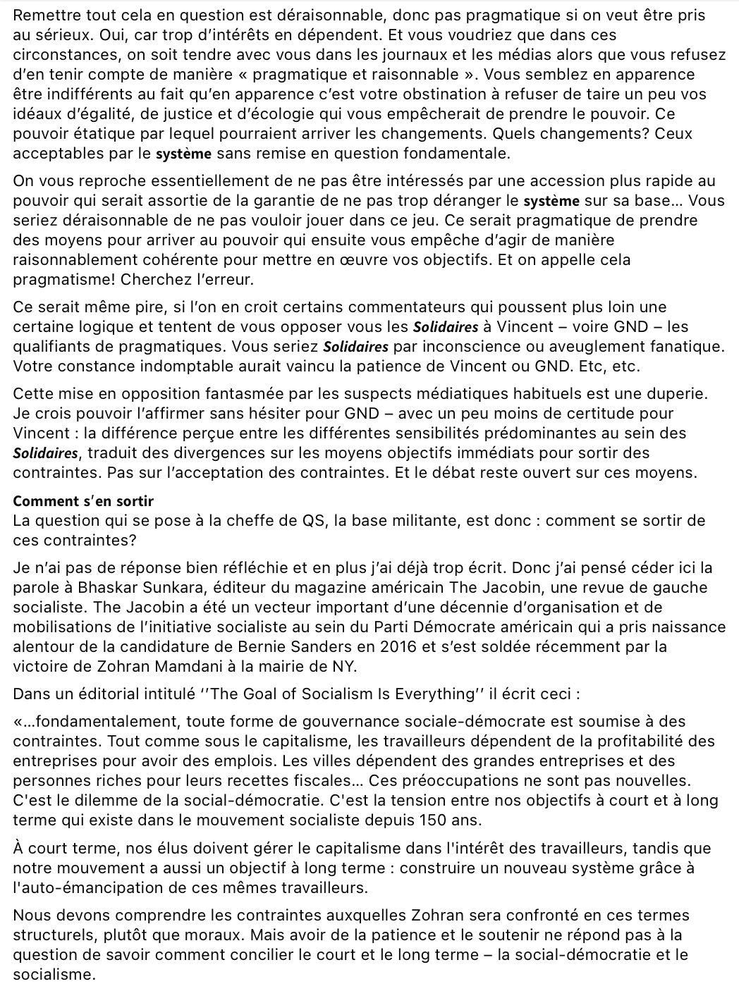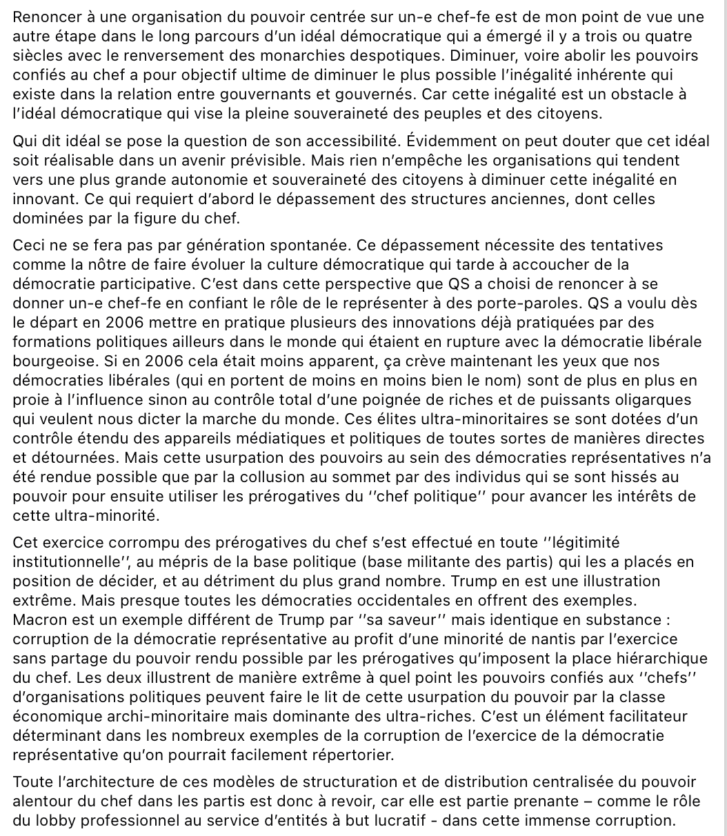 – Les appuis à QS stagnent en bas de 10%, et ce long texte ne présente aucun début de prise de conscience du problème de ce parti radical.