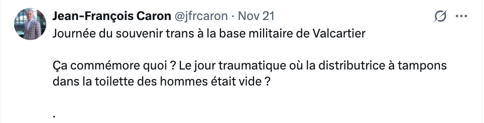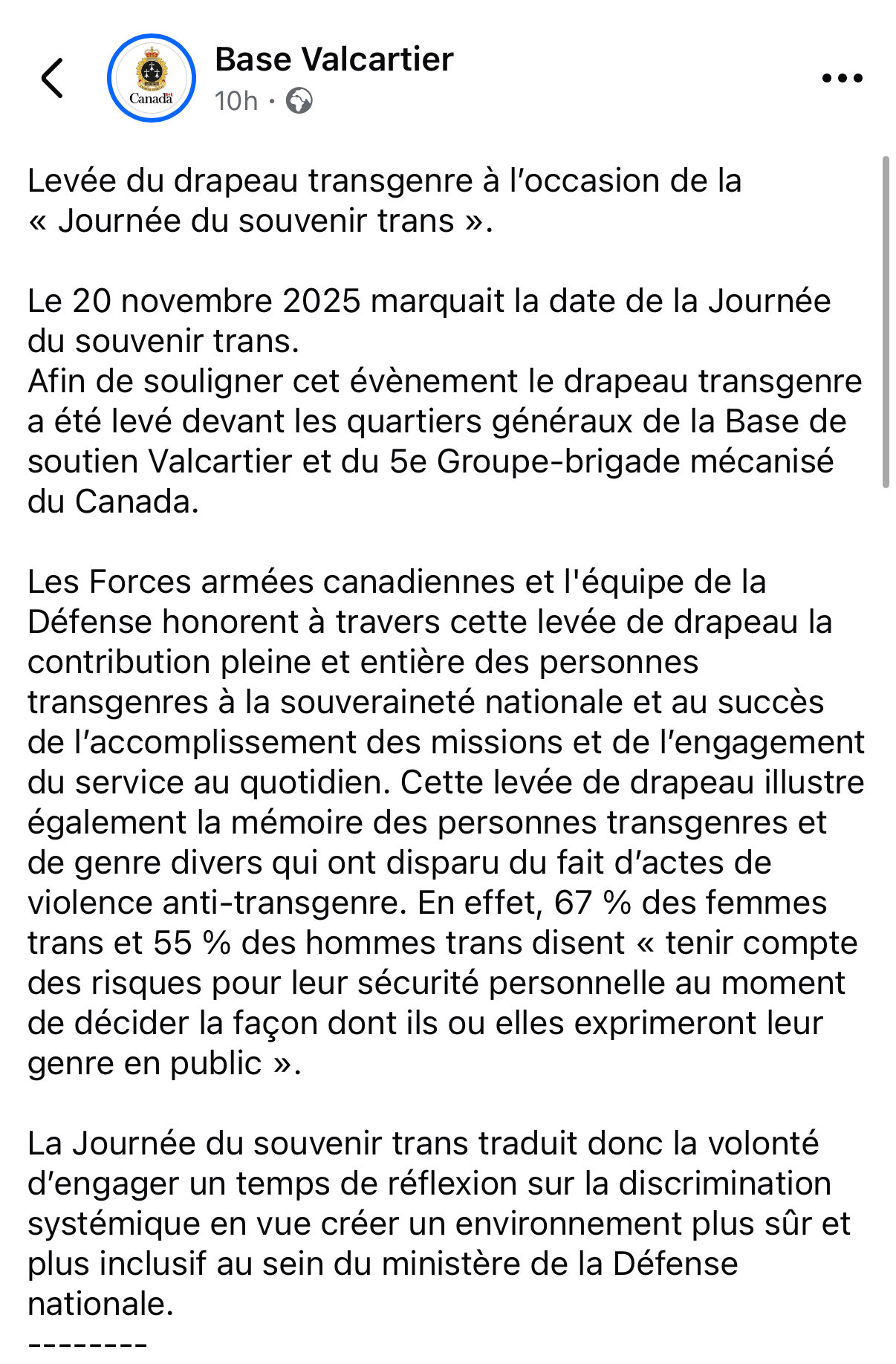 C’est l’armée canadienne et aucun drapeau du Canada sur les 4 mats. Rien contre les trans qui représentent possiblement moins de 1% des effectifs, mais ça prend un minimum.