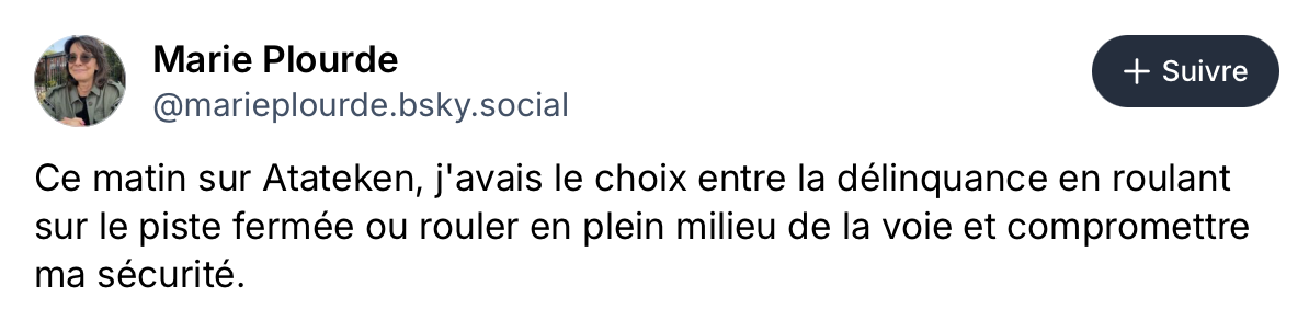 Tout pue la vertu dans cette publication, une vertueuse qui veut absolument utiliser piste cyclable sur la rue Amherst (oh désolé, il a été cancellé, c’est maintenant Atateken…).