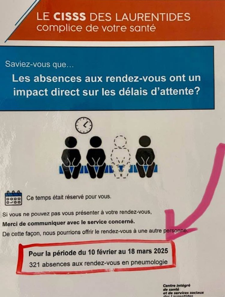 Cette affiche du CLSC devrait s’adresser aux gestionnaires du réseau, pas aux patients qui se débattent pour avoir un remdez-vous.