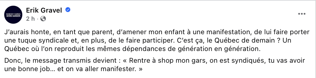 Alors pourquoi quand les gens voient des enfants dans les manifs de « pas la bonne gang » ça déchire leurs chemises?